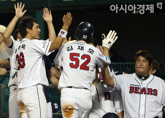 [아시아경제 정재훈 기자] 26일 오후 서울 잠실야구장에서 열린 '2013 한국야쿠르트 세븐 프로야구' LG 트윈스와 두산 베어스의 경기. 6회말 2사 3루 상황 정수빈의 1타점 적시타에 3루주자 김재호가 홈인하고 있다.