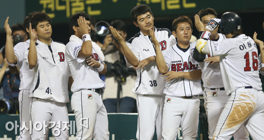 [아시아경제 정재훈 기자] 26일 오후 서울 잠실야구장에서 열린 '2013 한국야쿠르트 세븐 프로야구' LG 트윈스와 두산 베어스의 경기. 7회말 1사 2루 상황 이원석이 좌익수 뒤 투런홈런을 치고 동료들과 기쁨을 나누고 있다.
