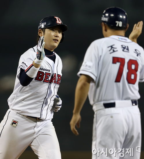 [아시아경제 정재훈 기자] 26일 오후 서울 잠실야구장에서 열린 '2013 한국야쿠르트 세븐 프로야구' LG 트윈스와 두산 베어스의 경기. 7회말 1사 2루 상황 이원석이 좌익수 뒤 투런홈런을 치고 조원우 코치와 기쁨을 나누고 있다.