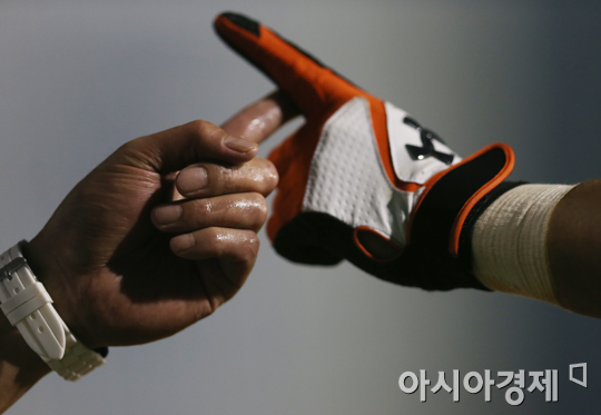 [아시아경제 정재훈 기자] 26일 오후 서울 잠실야구장에서 열린 '2013 한국야쿠르트 세븐 프로야구' LG 트윈스와 두산 베어스의 경기. 8회초 1사 1루 상황 박용택이 우익수 뒤 투런홈런을 치고 김기태 감독과 손가락을 부딪히고 있다.