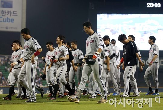 [아시아경제 정재훈 기자] 26일 오후 서울 잠실야구장에서 열린 '2013 한국야쿠르트 세븐 프로야구' LG 트윈스와 두산 베어스의 경기. 12:15 패배에 아쉬워하며 퇴장하는 LG 선수들.