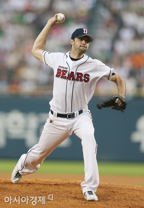 [아시아경제 정재훈 기자] 27일 오후 서울 잠실야구장에서 열린 '2013 한국야쿠르트 세븐 프로야구' 두산 베어스와 LG 트윈스의 경기. 두산 선발투수 핸킨스가 역투하고 있다.