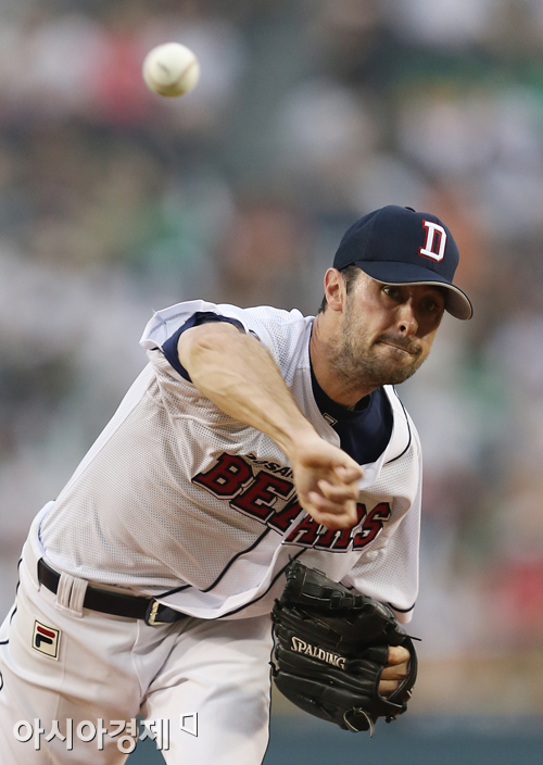 [아시아경제 정재훈 기자] 27일 오후 서울 잠실야구장에서 열린 '2013 한국야쿠르트 세븐 프로야구' 두산 베어스와 LG 트윈스의 경기. 두산 선발투수 핸킨스가 역투하고 있다.