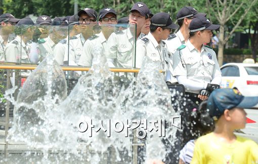 [아시아경제 백소아 기자] 서울 낮 기온이 32도를 기록하며 무더위를 보인 1일 서울 세종로 광화문광장 분수에서 대기 중인 의경들이 물놀이를 즐기는 어린이들을 부러운 눈빛으로 바라보고 있다.