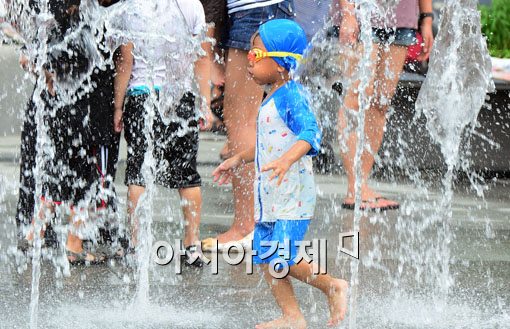 [아시아경제 백소아 기자] 서울 낮 기온이 32도를 기록하며 무더위를 보인 1일 서울 세종로 광화문광장 분수에서 어린이들이 더위는 잊은 듯 물놀이를 즐기고 있다.