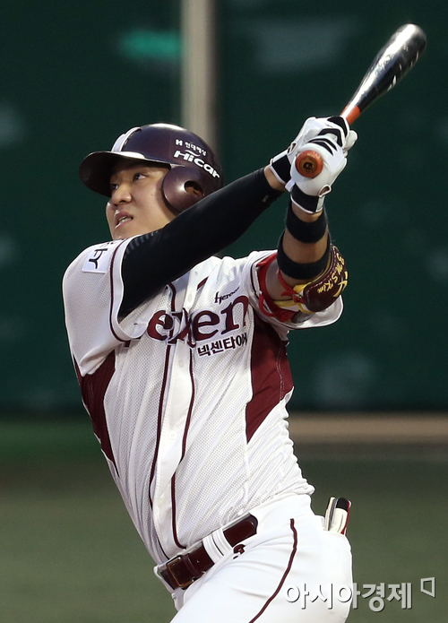 [아시아경제 정재훈 기자] 1일 오후 서울 목동야구장에서 열린 '2013 한국야쿠르트 세븐 프로야구' 넥센 히어로즈와 한화 이글스의 경기. 4회말 무사 만루 상황 김민성이 만루홈런을 날리고 있다.