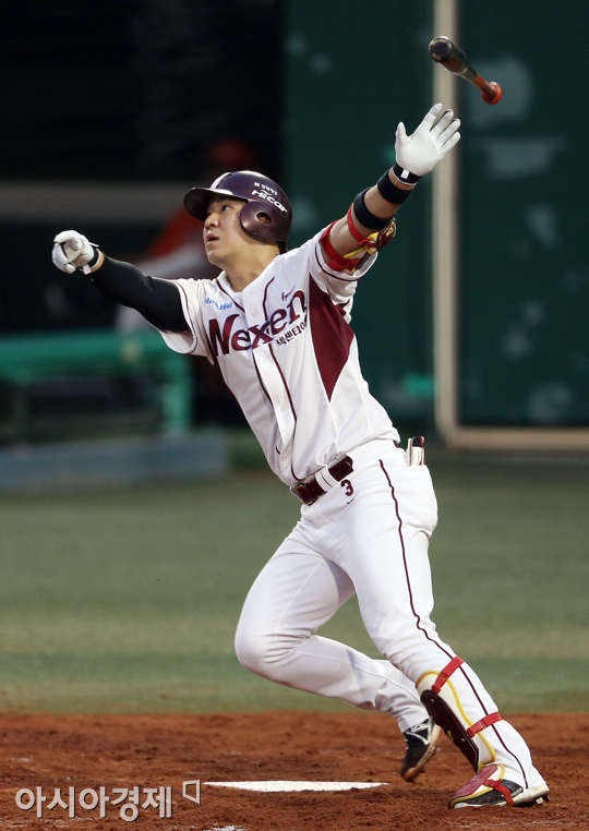 [아시아경제 정재훈 기자] 1일 오후 서울 목동야구장에서 열린 '2013 한국야쿠르트 세븐 프로야구' 넥센 히어로즈와 한화 이글스의 경기. 4회말 무사 만루 상황 김민성이 만루홈런을 날리고 있다.