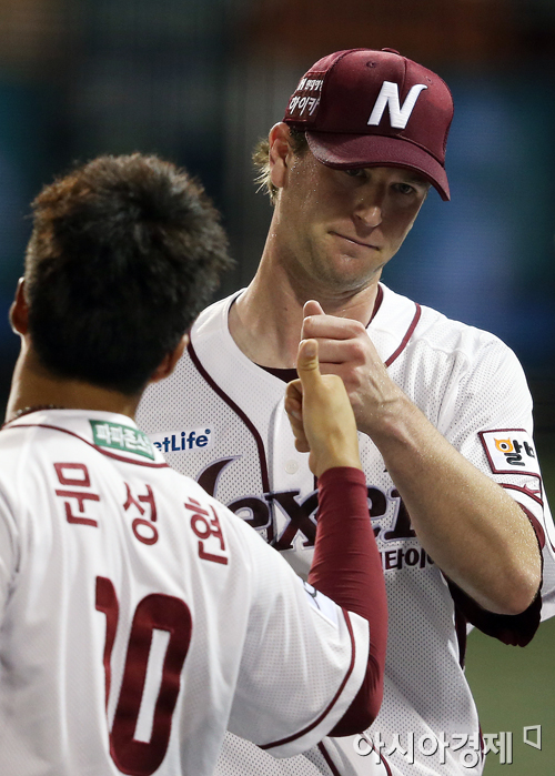 [아시아경제 정재훈 기자] 1일 오후 서울 목동야구장에서 열린 '2013 한국야쿠르트 세븐 프로야구' 넥센 히어로즈와 한화 이글스의 경기. 넥센 선발투수 밴 헤켄이 7회초까지 1실점 호투를 펼친 뒤 동료들의 격려를 받고 있다.