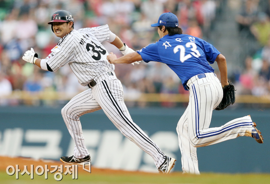 [아시아경제 정재훈 기자] 2일 오후 서울 잠실야구장에서 열린 '2013 한국야쿠르트 세븐 프로야구' LG 트윈스와 삼성 라이온즈의 경기. 1회말 무사 1루 상황 도루를 시도하던 1루주자 박용택이 협살에 걸려 차우찬에게 태그아웃당하고 있다.