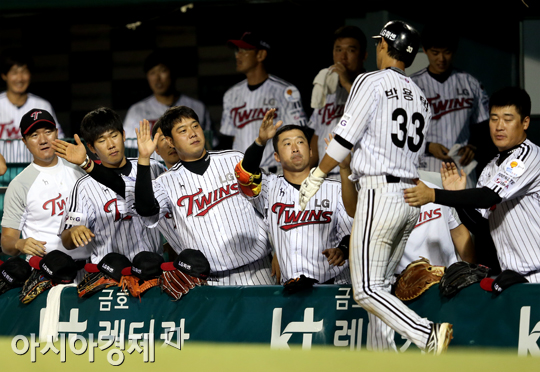 [아시아경제 정재훈 기자] 2일 오후 서울 잠실야구장에서 열린 '2013 한국야쿠르트 세븐 프로야구' LG 트윈스와 삼성 라이온즈의 경기. 6회말 1사 2루 상황 이진영의 적시타에 2루주자 박용택이 홈인하고 있다.