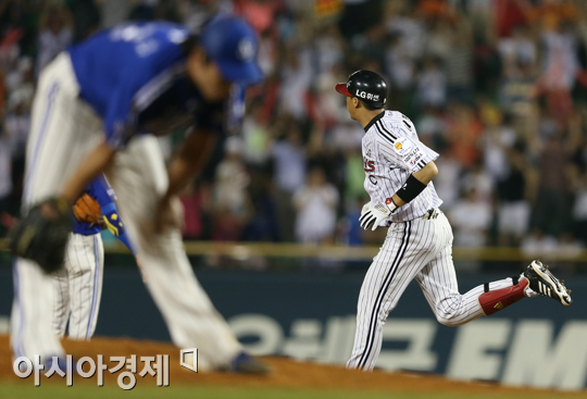 [아시아경제 정재훈 기자] 2일 오후 서울 잠실야구장에서 열린 '2013 한국야쿠르트 세븐 프로야구' LG 트윈스와 삼성 라이온즈의 경기. 6회말 2사 1루 상황 이병규가 우익수 뒤 투런홈런을 치고 그라운드를 돌고 있다.