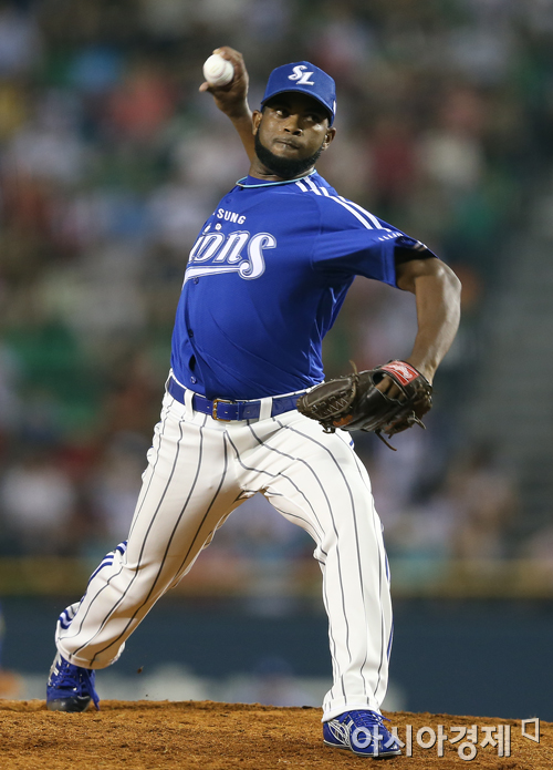 [아시아경제 정재훈 기자] 2일 오후 서울 잠실야구장에서 열린 '2013 한국야쿠르트 세븐 프로야구' LG 트윈스와 삼성 라이온즈의 경기. 삼성 새 외국인 투수 카리대가 차우찬에 이어 마운드에 올라 역투하고 있다.
