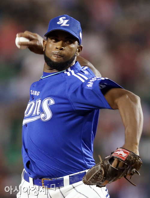 [아시아경제 정재훈 기자] 2일 오후 서울 잠실야구장에서 열린 '2013 한국야쿠르트 세븐 프로야구' LG 트윈스와 삼성 라이온즈의 경기. 삼성 새 외국인 투수 카리대가 차우찬에 이어 마운드에 올라 역투하고 있다.