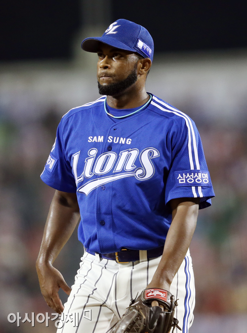 [아시아경제 정재훈 기자] 2일 오후 서울 잠실야구장에서 열린 '2013 한국야쿠르트 세븐 프로야구' LG 트윈스와 삼성 라이온즈의 경기. 삼성 새 외국인 투수 카리대가 7회말 투구를 마친 뒤 덕아웃으로 향하고 있다.