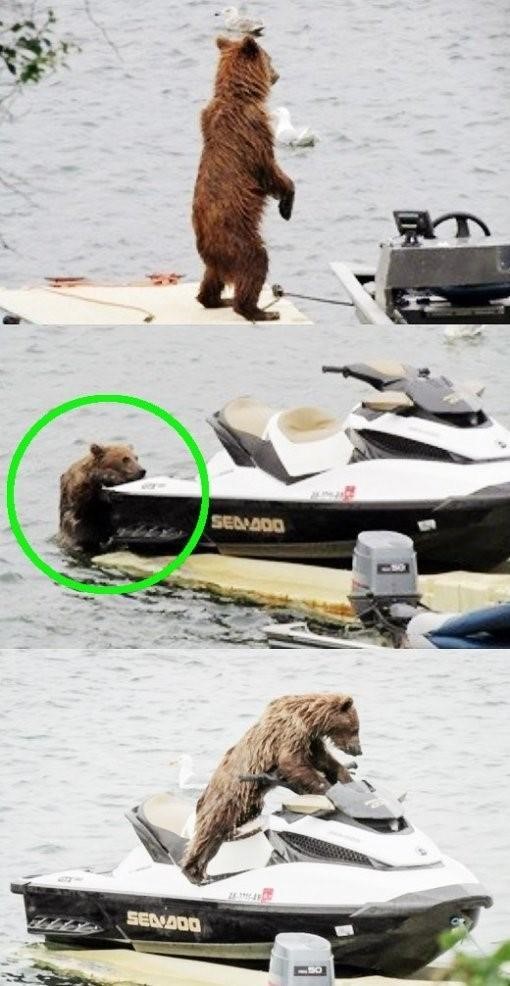 공개된 사진에는 갈색 곰 한 마리가 부둣가에 정박돼 있는 제트스키에 올라타고 있는 모습이 담겨 있다. 운전대를 잡고 균형을 잡고 있는 모습이 흡사 사람처럼 능숙한 모습이다.