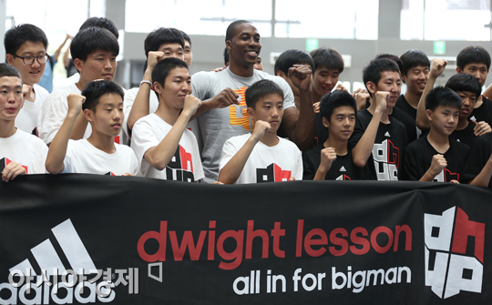 [아시아경제 정재훈 기자] 방한한 NBA 스타 드와이트 하워드가 18일 오전 서울 영등포구 타임스퀘어에서 열린 아디다스 농구 클리닉에서 농구 꿈나무들과 기념촬영을 하고 있다.
