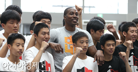 [아시아경제 정재훈 기자] 방한한 NBA 스타 드와이트 하워드가 18일 오전 서울 영등포구 타임스퀘어에서 열린 아디다스 농구 클리닉에서 농구 꿈나무들과 기념촬영을 하고 있다.