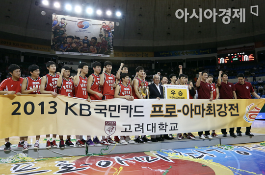 [아시아경제 전성호 기자]2013 KB국민카드 프로-아마최강전이 고려대의 우승으로 22일 성황리에 막을 내렸다. 지난해 12월 열린 1회 대회 평균 관중은 1780명. 반면 이번 대회는 4721명으로 2배 이상 증가했다. 고려대-상무의 결승전이 열린 잠실학생체육관에는 무려 6072명이 입장했다.