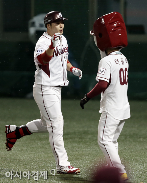 [아시아경제 정재훈 기자] 8일 오후 서울 목동야구장에서 열린 '2013 한국야쿠르트 세븐 프로야구 준플레이오프 1차전' 넥센 히어로즈와 두산 베어스의 경기. 1회말 2사 무주자 상황 박병호가 중견수 뒤 솔로홈런을 치고 턱돌이와 하이파이브하고 있다.