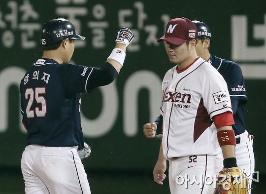 [아시아경제 정재훈 기자] 8일 오후 서울 목동야구장에서 열린 '2013 한국야쿠르트 세븐 프로야구 준플레이오프 1차전' 넥센 히어로즈와 두산 베어스의 경기. 2회초 1사 1, 3루 상황 양의지가 1타점 적시타를 치고 기뻐하고 있다.