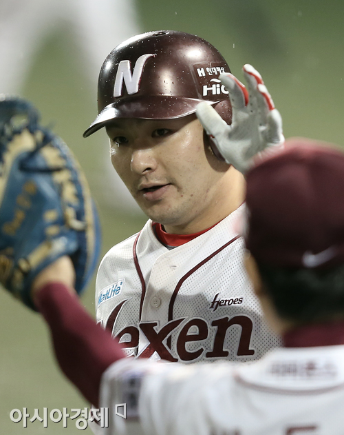 [아시아경제 정재훈 기자] 8일 오후 서울 목동야구장에서 열린 '2013 한국야쿠르트 세븐 프로야구 준플레이오프 1차전' 넥센 히어로즈와 두산 베어스의 경기. 1회말 2사 무주자 상황 박병호가 중견수 뒤 솔로홈런을 치고 동료들의 축하를 받고 있다.