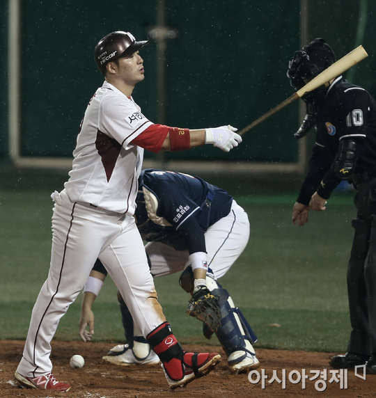 [아시아경제 정재훈 기자] 8일 오후 서울 목동야구장에서 열린 '2013 한국야쿠르트 세븐 프로야구 준플레이오프 1차전' 넥센 히어로즈와 두산 베어스의 경기. 6회말 선두타자 박병호가 볼넷으로 출루하고 있다.