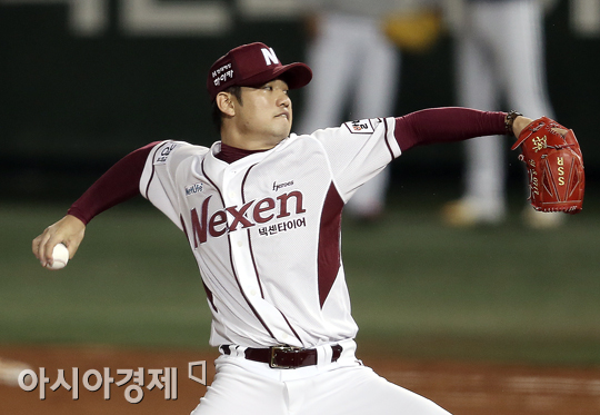 [아시아경제 정재훈 기자] 8일 오후 서울 목동야구장에서 열린 '2013 한국야쿠르트 세븐 프로야구 준플레이오프 1차전' 넥센 히어로즈와 두산 베어스의 경기. 넥센 손승락이 역투하고 있다.