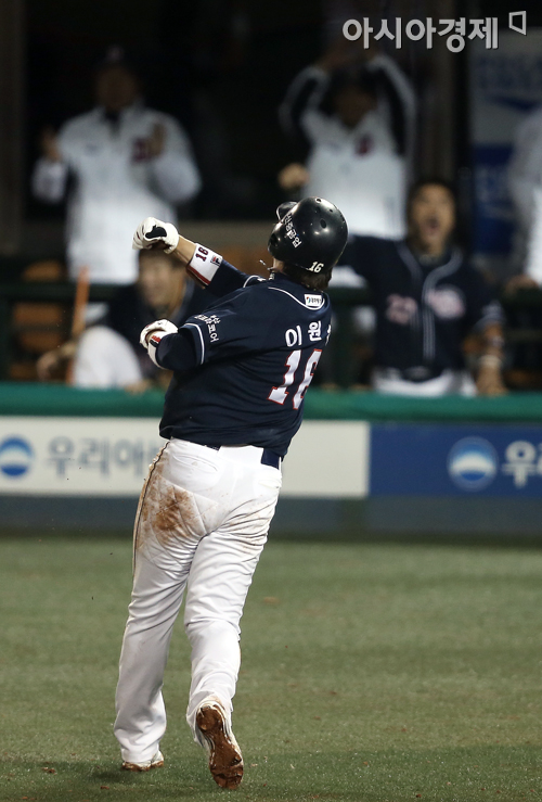 [아시아경제 정재훈 기자] 8일 오후 서울 목동야구장에서 열린 '2013 한국야쿠르트 세븐 프로야구 준플레이오프 1차전' 넥센 히어로즈와 두산 베어스의 경기. 9회초 2사 1루 상황 정수빈의 적시타에 홈을 밟은 1루주자 이원석이 기뻐하고 있다.