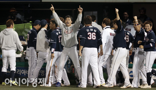[아시아경제 정재훈 기자] 8일 오후 서울 목동야구장에서 열린 '2013 한국야쿠르트 세븐 프로야구 준플레이오프 1차전' 넥센 히어로즈와 두산 베어스의 경기. 두산 덕아웃에서 9회초 동점 적시타를 친 정수빈을 향해 환호하고 있다.