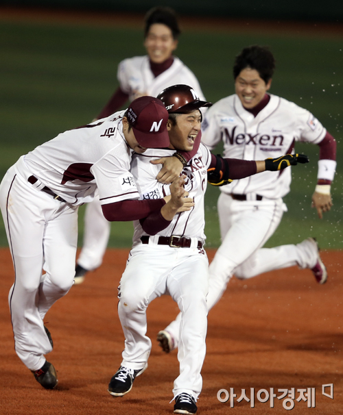 [아시아경제 정재훈 기자] 8일 오후 서울 목동야구장에서 열린 '2013 한국야쿠르트 세븐 프로야구 준플레이오프 1차전' 넥센 히어로즈와 두산 베어스의 경기. 9회말 2사 2, 3루 상황 이택근이 끝내기 안타를 치고 기뻐하고 있다.
