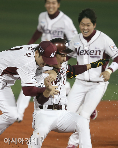 [아시아경제 정재훈 기자] 넥센 히어로즈가 8일 오후 서울 목동야구장에서 열린 두산 베어스와의 '2013 한국야쿠르트 세븐 프로야구 준플레이오프 1차전'에서 이택근의 끝내기 안타로 4:3 승리를 거뒀다.