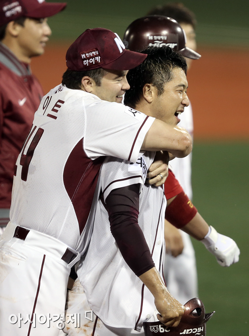 [아시아경제 정재훈 기자] 넥센 히어로즈가 8일 오후 서울 목동야구장에서 열린 두산 베어스와의 '2013 한국야쿠르트 세븐 프로야구 준플레이오프 1차전'에서 이택근의 끝내기 안타로 4:3 승리를 거뒀다. 나이트와 이택근이 승리 기쁨을 나누고 있다.