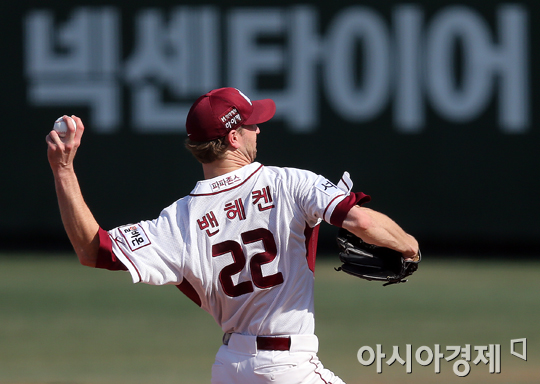[아시아경제 정재훈 기자] 9일 오후 서울 목동야구장에서 열린 '2013 한국야쿠르트 세븐 프로야구 준플레이오프 2차전' 넥센 히어로즈와 두산 베어스의 경기. 넥센 선발투수 밴 헤켄이 역투하고 있다.