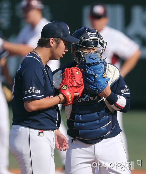 [아시아경제 정재훈 기자] 9일 오후 서울 목동야구장에서 열린 '2013 한국야쿠르트 세븐 프로야구 준플레이오프 2차전' 넥센 히어로즈와 두산 베어스의 경기. 2회말 1사 1, 2루 상황 유희관과 최재훈이 대화를 나누고 있다.