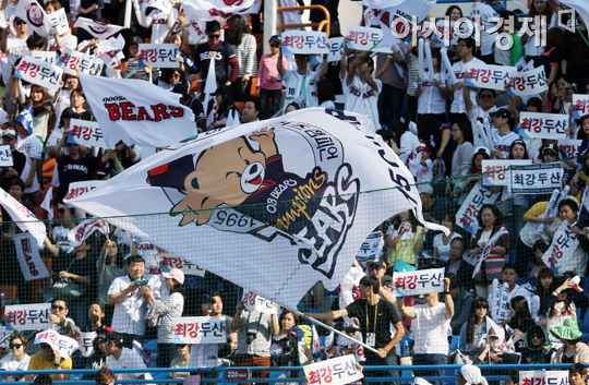 [아시아경제 정재훈 기자] 9일 오후 서울 목동야구장에서 열린 '2013 한국야쿠르트 세븐 프로야구 준플레이오프 2차전' 넥센 히어로즈와 두산 베어스의 경기. 두산 응원단이 응원을 펼치고 있다.