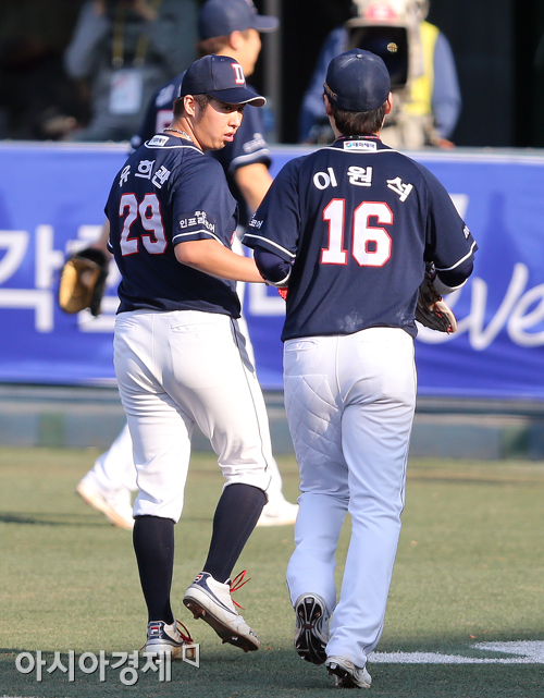 [아시아경제 정재훈 기자] 9일 오후 서울 목동야구장에서 열린 '2013 한국야쿠르트 세븐 프로야구 준플레이오프 2차전' 넥센 히어로즈와 두산 베어스의 경기. 6회말 투구를 마친 두산 선발투수 유희관이 덕아웃으로 향하며 이원석과 하이파이브하고 있다.