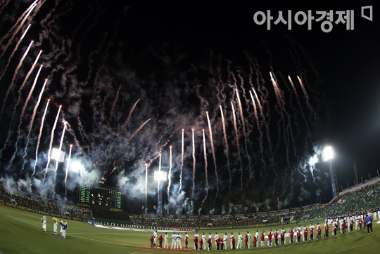 [대구=아시아경제 정재훈 기자] 24일 오후 대구시민야구장에서 열린 '2013 한국야쿠르트 세븐 프로야구' 삼성 라이온즈와 두산 베어스의 한국 시리즈 1차전. 구본능 총재의 개막 선언과 함께 불꽃이 하늘을 수놓고 있다.