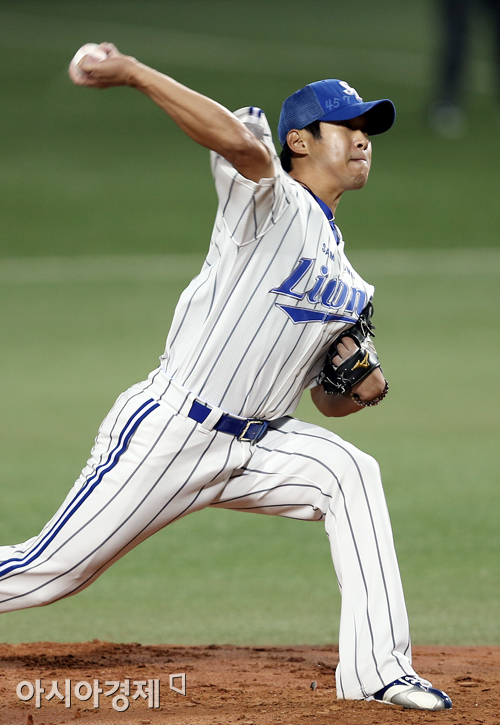 [대구=아시아경제 정재훈 기자] 24일 오후 대구시민야구장에서 열린 '2013 한국야쿠르트 세븐 프로야구' 삼성 라이온즈와 두산 베어스의 한국 시리즈 1차전. 삼성 선발투수 윤성환이 역투하고 있다.