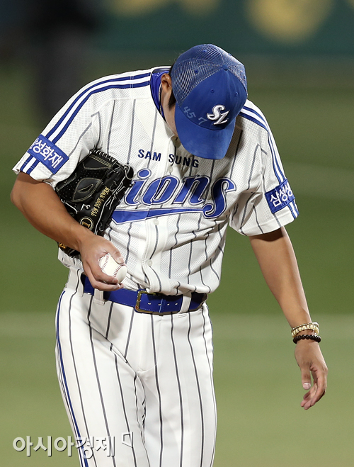 [대구=아시아경제 정재훈 기자] 24일 오후 대구시민야구장에서 열린 '2013 한국야쿠르트 세븐 프로야구' 삼성 라이온즈와 두산 베어스의 한국 시리즈 1차전. 삼성 윤성환이 2회초 2사 1, 3루 상황 손시헌에게 역전 적시타를 허용하고 마운드의 땅을 다지고 있다.