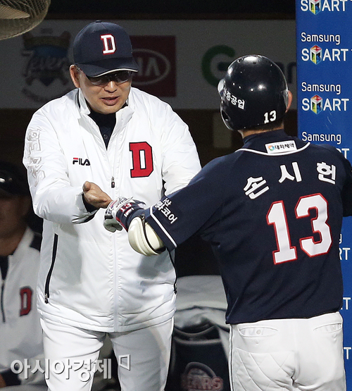 [대구=아시아경제 정재훈 기자] 24일 오후 대구시민야구장에서 열린 '2013 한국야쿠르트 세븐 프로야구' 삼성 라이온즈와 두산 베어스의 한국 시리즈 1차전. 6회초 선두타자 손시헌이 좌익수 뒤 솔로홈런을 치고 김진욱 감독과 기쁨을 나누고 있다.