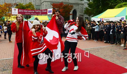 [아시아경제 백소아 기자] 29일 서울 고려대 안암캠퍼스에서 열린 '2013 외국인학생 축제'에서 캐나다 학생과 메이트들이 자국의 전통의상을 입고 패션쇼를 진행하고 있다. 이번 축제는 외국인학생들이 자국의 문화, 유학, 여행등을 알리고 서로 다른 문화 간의 이해와 소통을 위해 마련되었다.