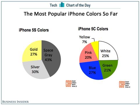 아이폰5c의 경우 블루 27%, 화이트 25%, 그린 21%, 핑크 20%로 큰 차이가 없었지만 옐로만 7%로 가장 인기가 없는 모델로 나타났다.