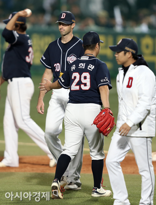 [대구=아시아경제 정재훈 기자] 1일 오후 대구시민야구장에서 열린 2013 한국야쿠르트 세븐 프로야구 삼성 라이온즈와 두산 베어스의 한국 시리즈 7차전. 두산 선발투수 유희관이 5회말 1사 만루 상황 핸킨스와 교체되고 있다.