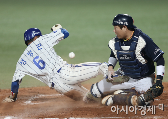 [대구=아시아경제 정재훈 기자] 1일 오후 대구시민야구장에서 열린 2013 한국야쿠르트 세븐 프로야구 삼성 라이온즈와 두산 베어스의 한국 시리즈 7차전. 6회말 1사 만루 상황 최형우의 3루수 땅볼 때 실책을 틈타 2, 3루 주자 정병곤, 박한이가 홈인했다. 홈인하는 정병곤.