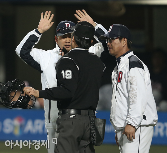 [대구=아시아경제 정재훈 기자] 1일 오후 대구시민야구장에서 열린 2013 한국야쿠르트 세븐 프로야구 삼성 라이온즈와 두산 베어스의 한국 시리즈 7차전. 6회말 1사 만루 상황 최형우의 3루수 땅볼 때 실책을 틈타 2, 3루 주자 정병곤, 박한이가 홈인했다. 김진욱 감독이 항의를 하고 있다.
