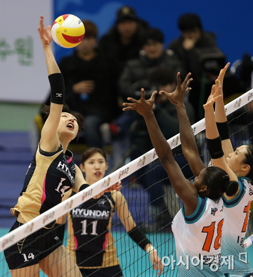 [수원=아시아경제 정재훈 기자] 17일 오후 수원실내체육관에서 열린 NH농협 2013-2014 V리그 여자부 현대건설과 GS칼텍스의 경기. 현대건설 양효진이 스파이크를 때리고 있다.