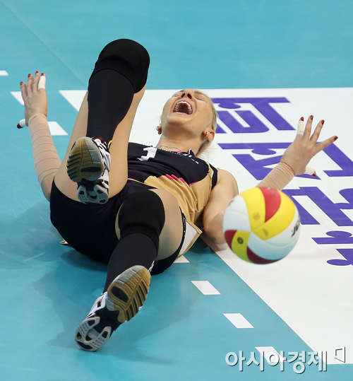 [수원=아시아경제 정재훈 기자] 17일 오후 수원실내체육관에서 열린 NH농협 2013-2014 V리그 여자부 현대건설과 GS칼텍스의 경기. 현대건설 바샤가 실점에 아쉬워하고 있다.