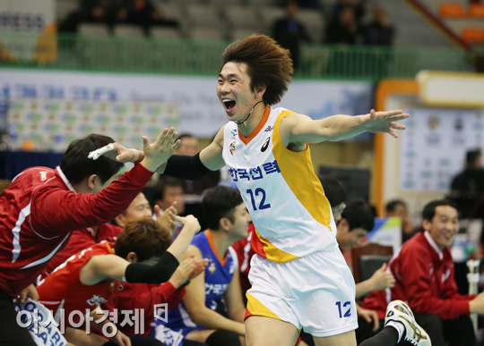 [수원=아시아경제 정재훈 기자] 17일 오후 수원실내체육관에서 열린 NH농협 2013-2014 V리그 남자부 한국전력과 우리카드의 경기. 한국전력 전광인이 득점에 기뻐하고 있다.