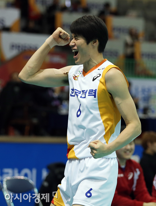[수원=아시아경제 정재훈 기자] 17일 오후 수원실내체육관에서 열린 NH농협 2013-2014 V리그 남자부 한국전력과 우리카드의 경기. 한국전력 방신봉이 득점에 기뻐하고 있다.