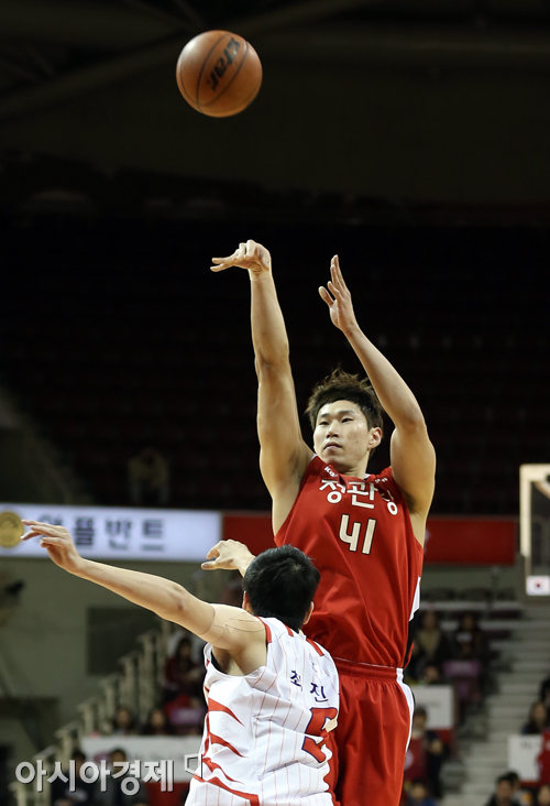[안양=아시아경제 정재훈 기자] 24일 오후 안양실내체육관에서 열린 'KB국민카드 2013~2014 프로농구' KGC와 오리온스의 경기. KGC 오세근이 슛을 쏘고 있다.